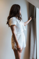 The Luisa set is a romantic organic cotton pyjama set with a flattering short-sleeved shirt and matching lace-trimmed shorts. Made from 100% breathable organic cotton dobby, it's ideal as sustainable loungewear or ethical sleepwear. With delicate lace, mother-of-pearl buttons, and a soft cropped fit, Luisa combines comfort and elegance – perfect for warm nights, slow mornings, or stylish lounging.